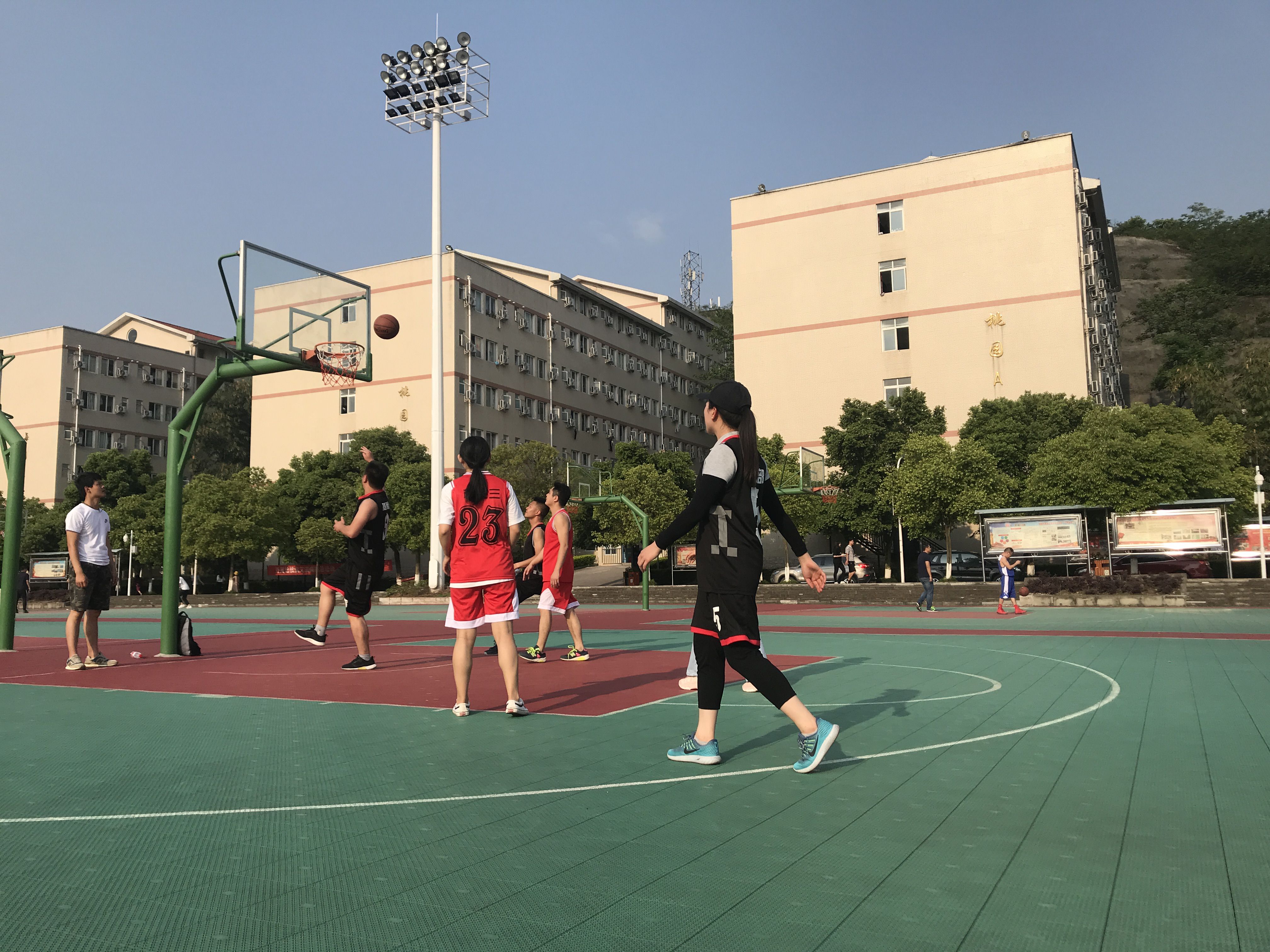 2019年4月23日下午五点,基础部分工会的篮球健将们与机关三分工会的队员们在田径场上展开了一场战火激烈的交锋。经过烈日炙烤下的球场映射着球员们身姿矫健的倩影,在双方啦啦队的欢呼和呐喊声中,奋力拼搏的健儿们将体育竞技与体育精神的融合淋漓尽现,为观看比赛的师生们上了多彩生动的一课。