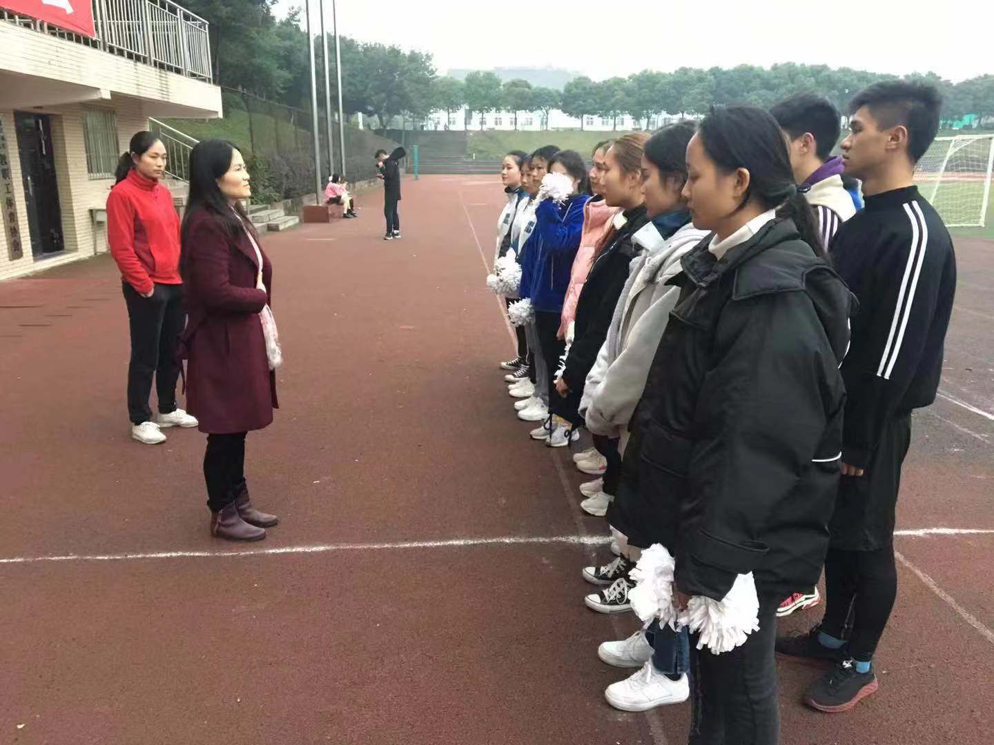 20181129日下午17:40,啦啦操代表队在田径场举行了赛前出征仪式。基础教学部的主任许永莉同志、体育教研室主任唐流泉同志、教练员张燕老师,全体啦啦操代表队成员参加。