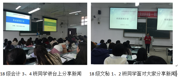 2018年9月份以来,公司思政课堂全面推行“时政新闻分享”。每一次思政课都用5分钟时间让2-3位同学分享最近时政新闻,并要求他们用所学理论进行分析,谈看法谈感想,然后允许1-2位同学针对他们的分享发表自己的看法,最后由教师作简要点评。
