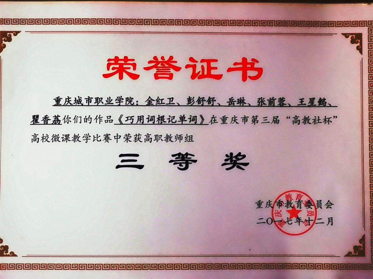 公司英语教研室教师(金红卫、彭舒舒、岳琳、张前蓉、王星懿、翟香荔)的微课作品—《巧用词根记单词》获得三等奖的佳绩。